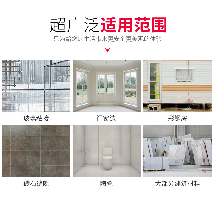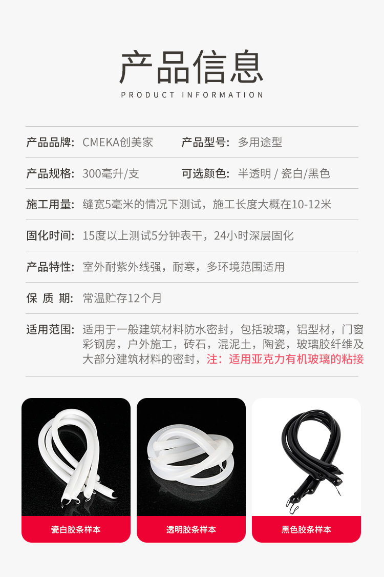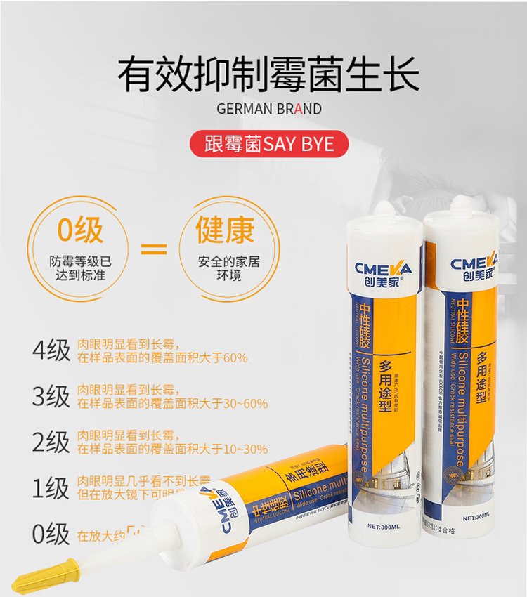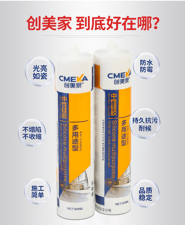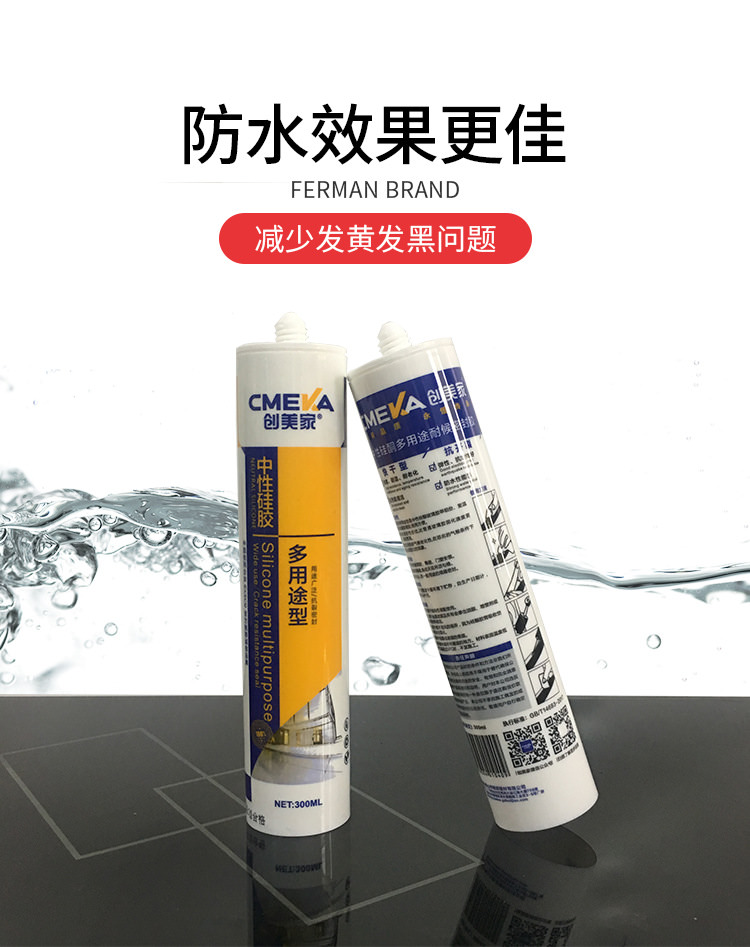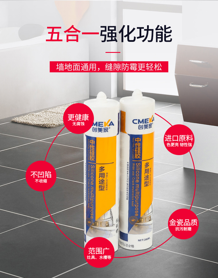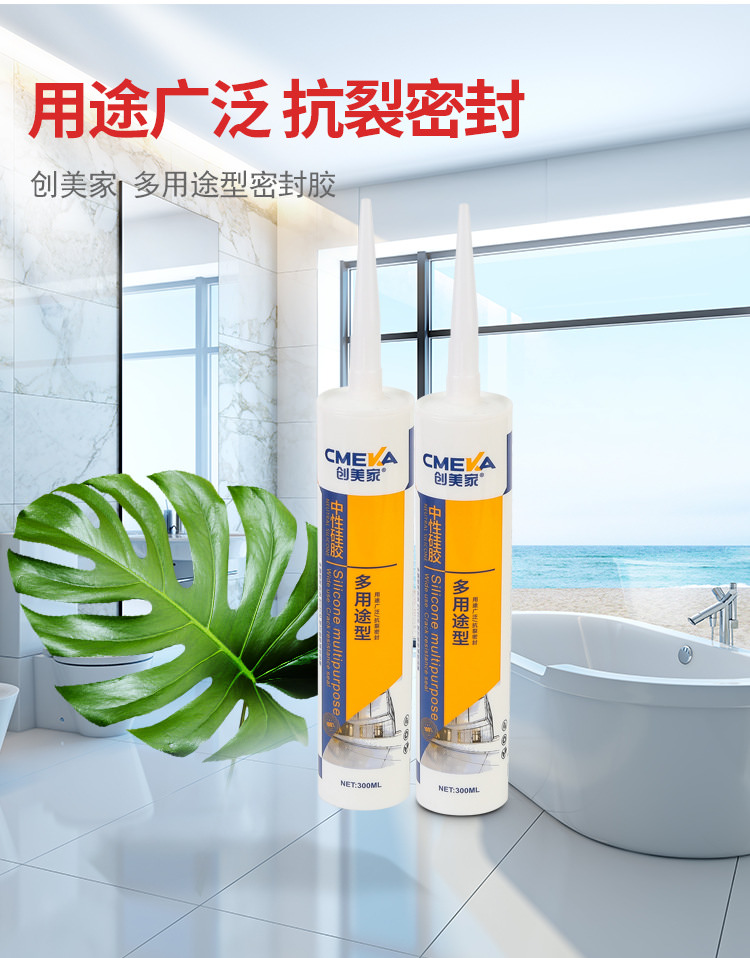 1、創(chuàng)美家-多用途系單組份、中性脫醇型、高模量、室溫固化硅酮密封膠。